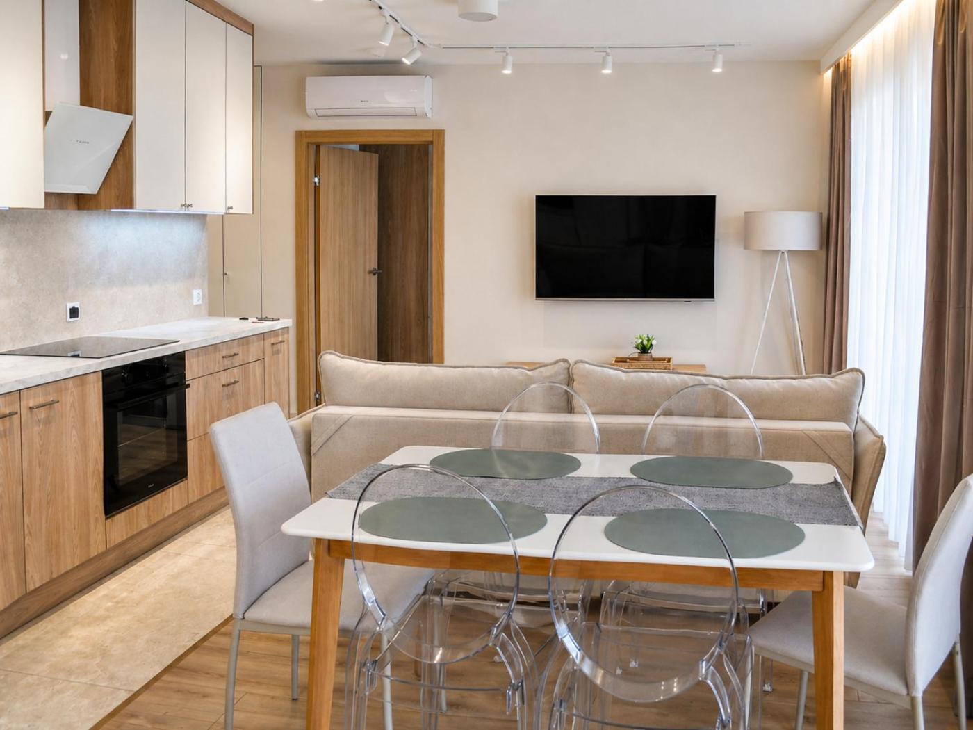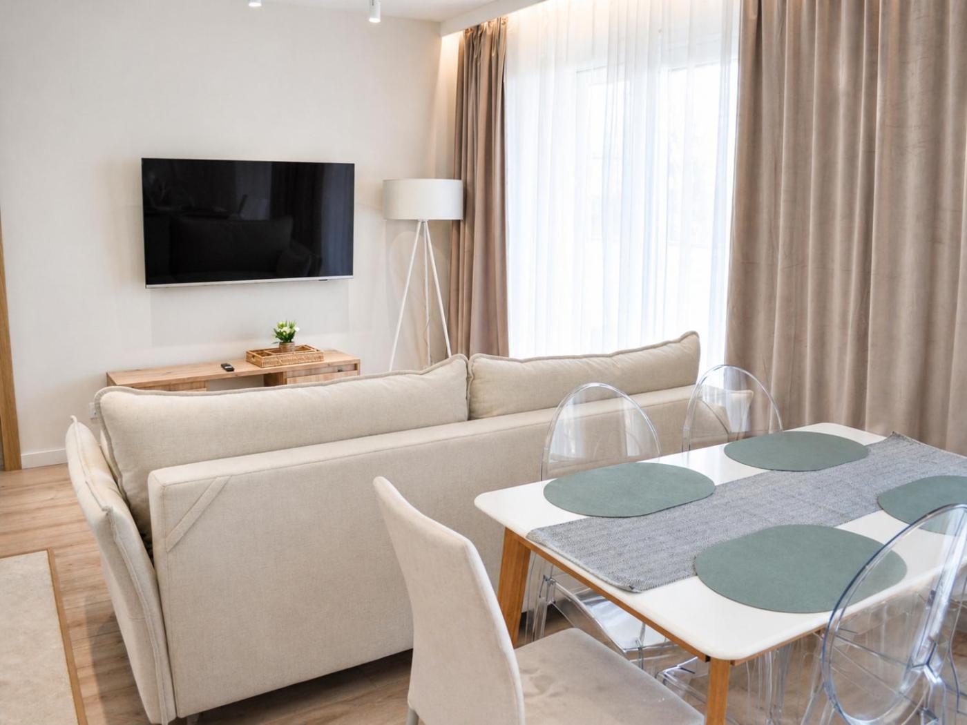 Apartament z 2 sypialniami. The well-equipped kitchen features a stovetop, a refrigerator, a dishwasher and kitchenware. The air-conditioned apartment provides a flat-screen TV with streaming services, a washing machine, a private entrance, soundproof walls as well as garden views. The unit offers 3 beds. Apartament - 6 osobowy. Powierzchnia pokoju ok.: 50 mkw.