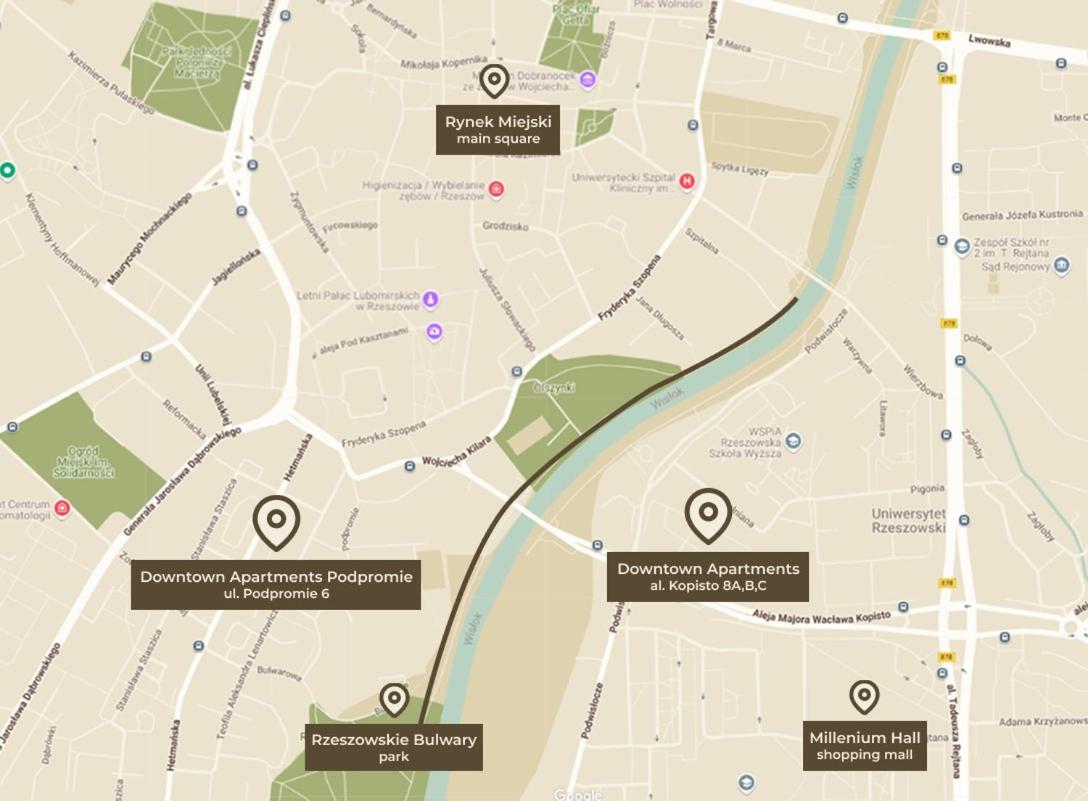 Obiekt Downtown Apartments Sinatra air-conditioned oferuje taras, balkon oraz widok na miasto. Odległość ważnych miejsc od obiektu: Centrum handlowe Nowy Świat – około 4 km. Obiekt zapewnia bankomat. W odległości 18 km znajduje się Zamek w Łańcucie.